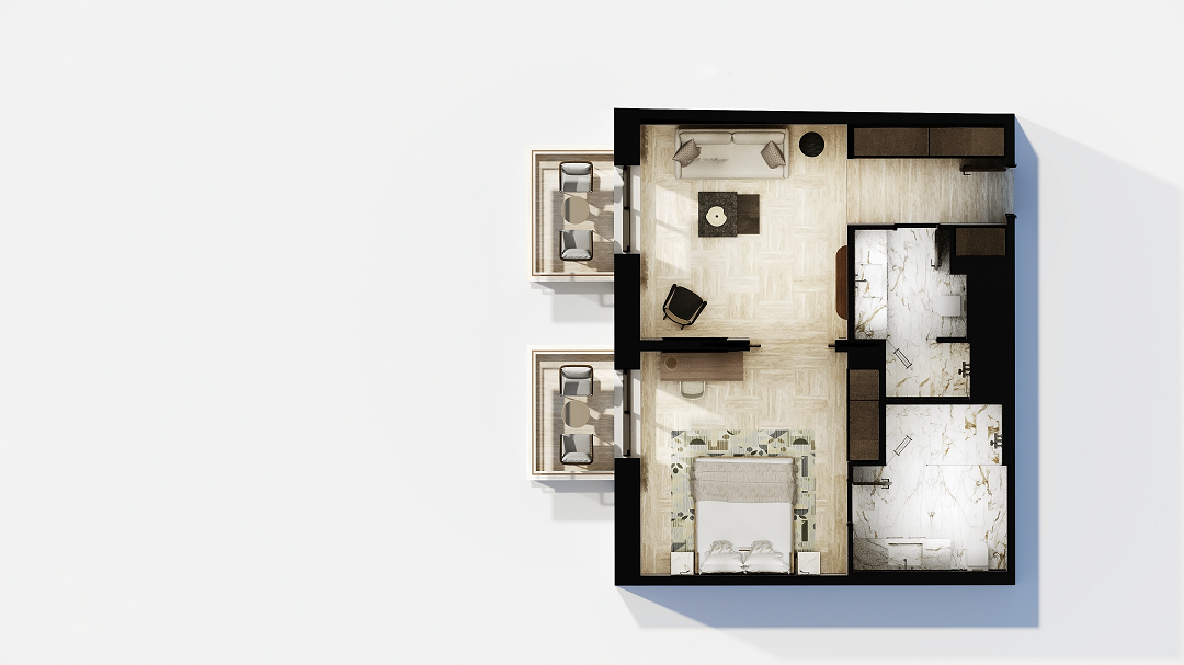 This beautifully renovated accommodation exudes elegance and offers approximately 50 m² of indoor space with views of the landscaped surroundings. It features a cozy sitting area with a rollaway bed that can comfortably accommodate two children or serve as a lounge area for a couple who prefer extra comfort. The accommodation includes two bathrooms, two showers and is thoughtfully equipped with air conditioning, comfortable double bed, a TV for your entertainment, a safety deposit box to ensure the security of your belongings, a hairdryer, and a minibar.