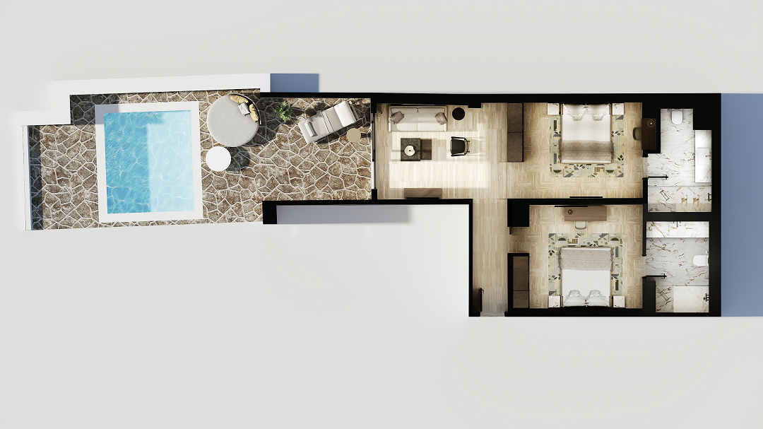 Suita spațioasă, dotată cu piscină privată, decor șic modern și facilități de top, vă oferă o evadare către o vacanță de întinerire, o invitație de a vă răsfăța la maximum.
