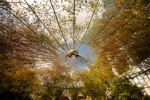 Birdcage-style decorative canopy with metal ribs, trees and orange foliage visible through to the sky at Eagles Resort