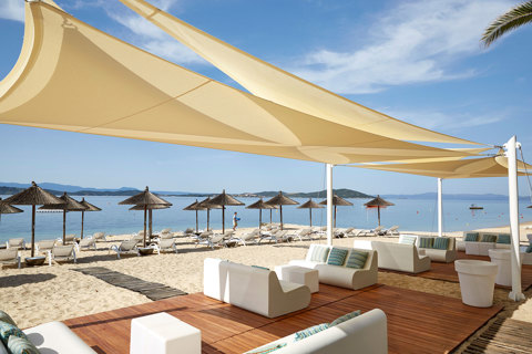 Wooden shady deck on a sunny beach with sofas and tables near the sun loungers at Eagles Resort