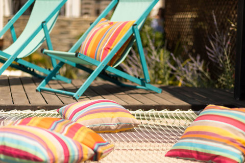 Lounge on a wooden deck by the beach near the sun loungers with direct access to the sea at Eagles Resort