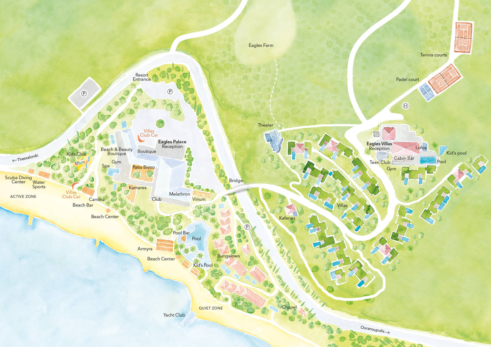 Eagles Resort, este o stațiune de cinci stele în Halkidiki, Grecia, care oferă facilități de clasă mondială și o varietate de opțiuni ancorate în confort, eleganță și excelență. Între grădini mediteraneene luxuriante, palmieri impunători și plantații de măslini, vacanța de vis vă așteaptă în timp ce personalul nostru vă stă oricând la dispoziție.